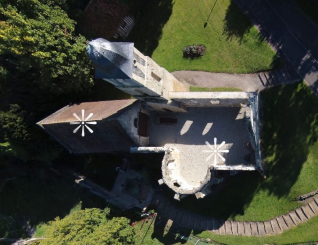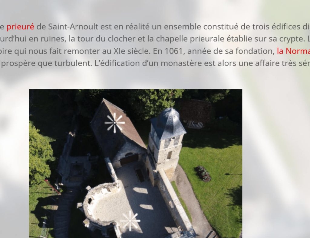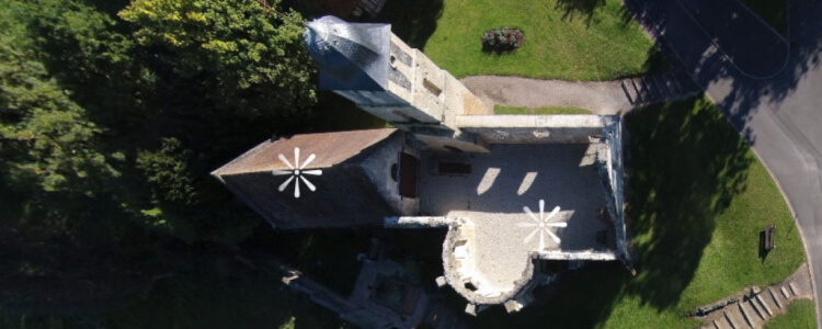 Découvrez le prieuré depuis les airs : survol des ruines, du clocher et des jardins environnants. Penchez-vous sur les structures anciennes, admirez les vestiges qu’offre le site tout en percevant son environnement naturel.